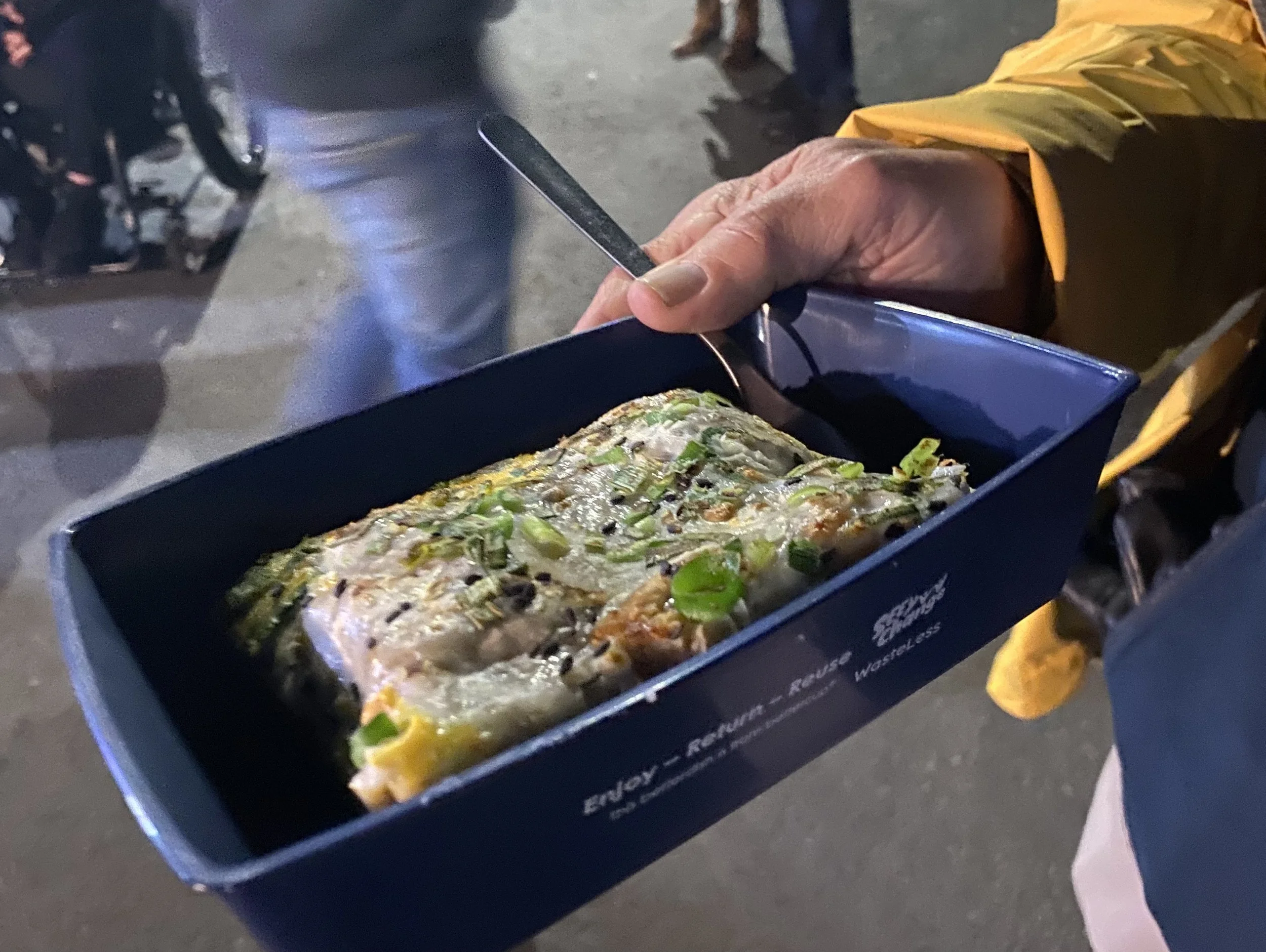 Event D provided reusable plates, bowls and cutlery. They also had reusable cups for hot drinks and reusable plastic wine and beer cups ($5 deposit). They had an industrial dishwasher. All vendors were required to provide food and drink using the event’s or customers’ reusable items.